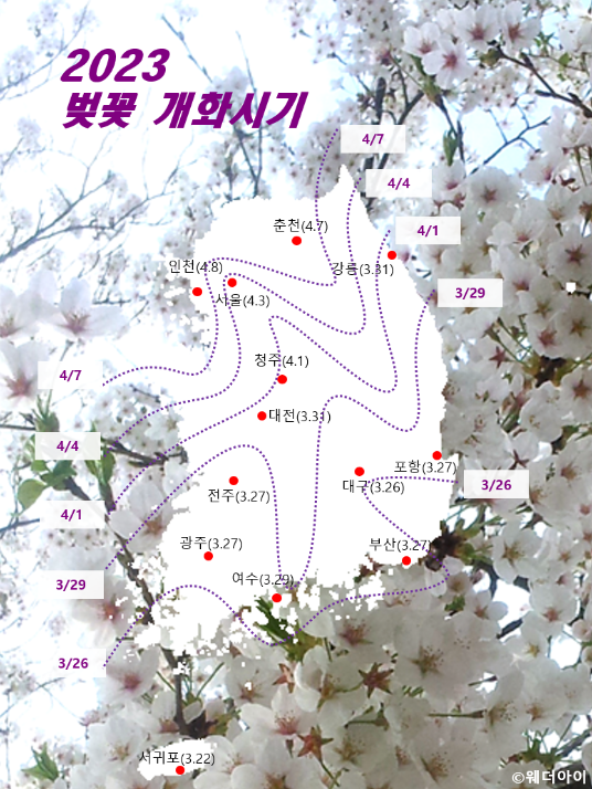 3월 22일 제주와 남부지방은 3월 26일이며, 중부지방은 3월 31일~4월 7일입니다.
